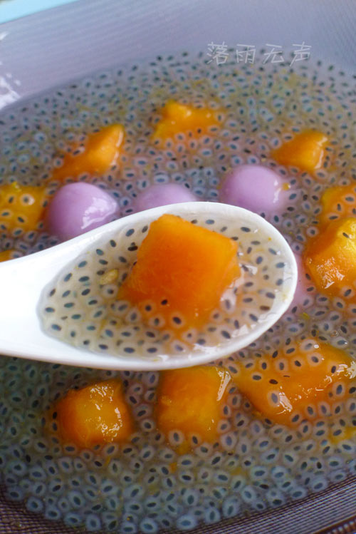 山粉圆,是将山香草上采收的黑色种子泡在水中,经过煮熟制成的。煮熟后的黑色种子表面会产生胶质,再加上糖水就成了山粉圆。由于山香草含有白桦脂酸,故据说它有健胃整肠、退火降血压的功效。 第一次看到这东东的时候感觉很奇妙,有点象弥猴桃的籽,也有点象火龙果的籽,一般港式甜品店可以看到。
