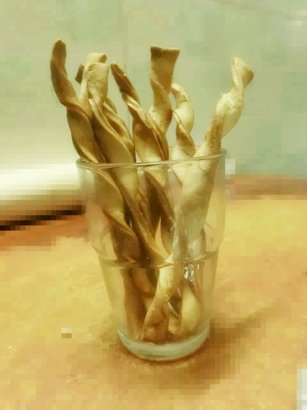 4、拉住长条的两端,扭成螺旋型,不过要固定,因为拷的时候会扭动。刷上一层全蛋液(没有包含在原料中)烤箱预热180度,烘烤20分钟。