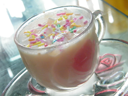 及以下步骤:之后装杯(也可以这样喝了,这样的话就是奶昔) 把杯子放到冰箱的冷藏格(一般冰箱下面那个) 冻3~5个小时吧,好了之后有条件可以加些椰果,提高口感 有条件的话,可以放一些彩针下去装饰 棉花糖会慢慢的融化。。搅拌均匀 嘿嘿~搅拌好了! 之后装杯(也可以这样喝了,这样的话就是奶昔) 把杯子放到冰箱的冷藏格(一般冰箱下面那个) 冻3~5个小时吧,好了之后有条件可以加些椰果,提高口感 有条件的话,可以放一些彩针下去装饰