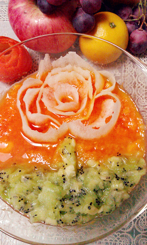 及以下步骤:可按照自己口感在木瓜中放入酸奶一起打碎,会有不一样的口感,不妨自己试一试!~ 把木瓜去籽,挖出 用料理机打碎乘出备用 把木瓜去籽,挖出 用料理机打碎乘出备用 梨先去皮,后像削水果一样将其削皮,削成一整条的梨肉皮,然后卷起摆到盘中 摆置成花瓣绽放的样子 奇异果切丁或打碎,放在底部装饰成叶子 成品图 可按照自己口感在木瓜中放入酸奶一起打碎,会有不一样的口感,不妨自己试一试!~