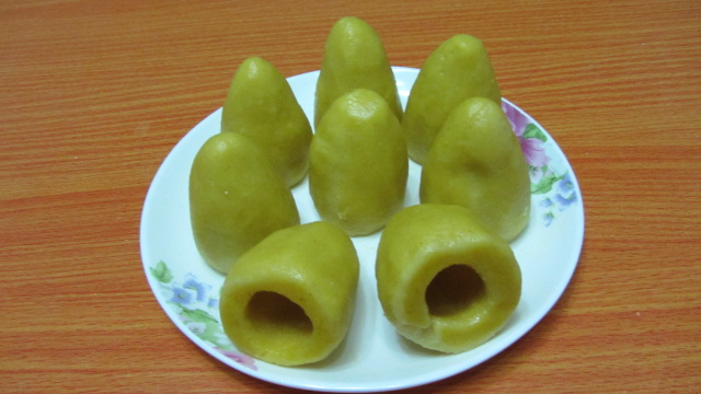 2、面团分成16等份,取一份搓成圆柱形,底部墩平,放在右手心上,左手蘸水,拇指从底部进入,配合食指边捏边旋转,使窝窝头的心越来越大,并保持窝窝头的壁薄厚均匀,墩齐底部就做成了。