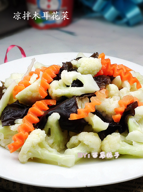 这是一道简易的凉拌菜。菜花质地细嫩,味甘鲜美。营养丰富。是最好的血管清理剂,能够阻止胆固醇氧化,防止血小板凝结成块,因而减少心脏病与中风的危险。木耳质地柔软,口感细嫩,味道鲜美,风味特殊,是一种营养丰富的著名食用菌。
