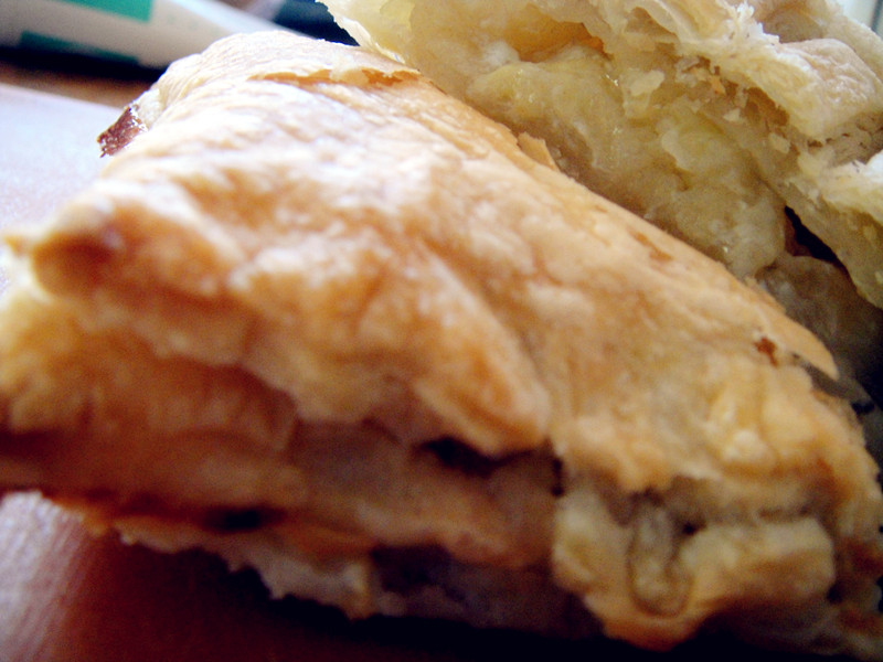 及以下步骤:放入烤盘,进烤箱。200度,20分钟就好了哟~ 飞饼一片。 切成长方形。 飞饼一片。 切成长方形。 香蕉切片,放在飞饼的一边。 浇上炼乳(不要过多哦~不然会滴下来飞饼就合不了口了,也不方便清理哦)。 三边捏合。 用刀在表面划几道。 放入烤盘,进烤箱。200度,20分钟就好了哟~