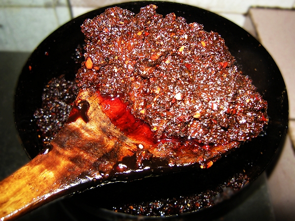 及以下步骤:芝麻入锅,小火炒香。 盛出放凉。 炒好的辣椒和花椒用搅拌机磨碎。不喜欢太辣的话,可以把辣椒籽挑出,只用辣椒皮。 炒好的芝麻也用搅拌机磨碎。不用磨很细。 磨好的辣椒和芝麻粉。 准备一瓶半甜面酱,我正好有一瓶旅游时带回来的猪肉酱,冒充甜面酱一起用了。 锅中多放点油,大概能没过猪肉的量。 猪肉丝入锅,中小火煸。 用铲子翻一翻,避免糊底。 关火放凉。