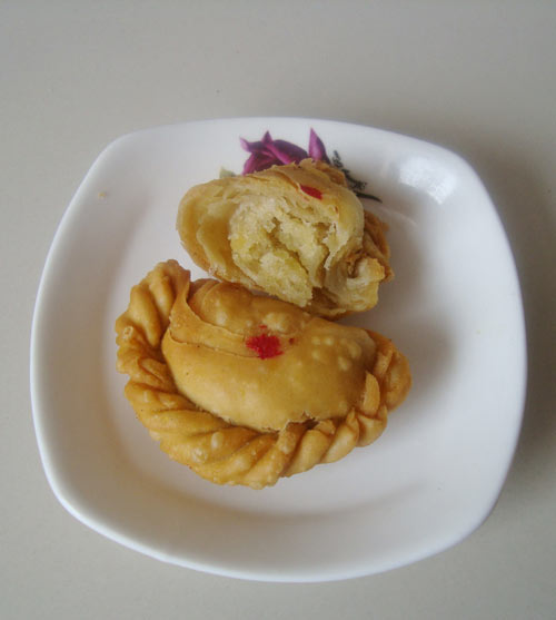 及以下步骤:小圆片内包上馅儿,对折,捏住边儿。 从右到左捏出花褶。 点上红色素,春节的喜庆立刻跃入眼帘。 炒锅内放植物油,烧热,下糖饺炸熟。 呵呵,今年春节的招牌小吃。许多朋友来尝了,还拿走几个。 小圆片内包上馅儿,对折,捏住边儿。 从右到左捏出花褶。 点上红色素,春节的喜庆立刻跃入眼帘。 炒锅内放植物油,烧热,下糖饺炸熟。 呵呵,今年春节的招牌小吃。许多朋友来尝了,还拿走几个。