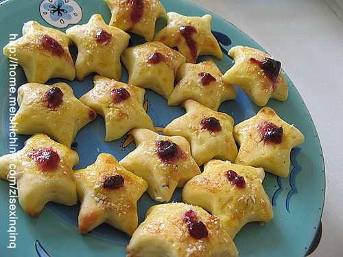 及以下步骤:用擀面杖(或手掌)将面团擀开。 撒上切碎的葡萄干、提子干、核桃粒(我用的干果是烤过的)。 从上到下卷成圆柱体。 盘起来。 按一下,擀成圆形。 将饼干模具刷上少许食用油,放到圆形面片上,按下去。 然后将模具提起来(这样面片就会固定在五角星模具上,移到提前抹油的烤盘上方,小心翼翼地用手戳一下,这样漂亮的小面包就做好了。 操作过程中亲们要有耐心哦! 中间不用饧发(家里有暖气,室温大概是20度左右),直接刷蛋液。 撒椰蓉。 这种五角星小面包是让女儿带到学校里跟同寝室的同学一起吃的,我做了两盘。剩下的边角料揉成团后又擀开,直接切了几块,又做了一盘。