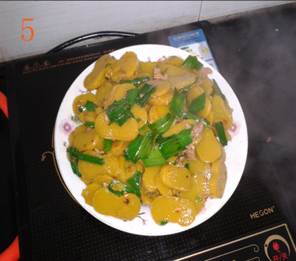 4、做好的黄元米果色黄味鲜,低温可保存1-2月。冷却的黄元米果切成片状,配少许鲜瘦肉(腊肉味更佳哦)、红辣椒、大蒜加油、盐、生抽酱油爆炒装盘。