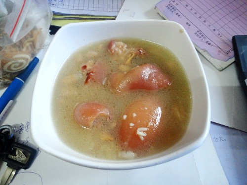 3、煮5分钟,把猪脚捞起用清水冲洗一下。