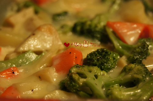 偶从小就不爱喝牛奶,也不爱吃奶制品的食物,但是一直对奶酪情有独钟~~~~~~这道菜里不仅有能拉长丝儿的马苏里拉,还含有大量的蔬菜,像一般人们都不爱吃的胡萝卜,西兰花等,这时都统统可以往里面加,别说味道倒还是挺搭的,另外还有土豆、口蘑等能增加口感的菜菜,一起烤来吃还是挺不错滴,灰常适合做给不爱吃蔬菜的小朋友,当然挑食的大朋友们也适合吃哈~~~~~~恩,都来试一试吧,保证你会爱上它......