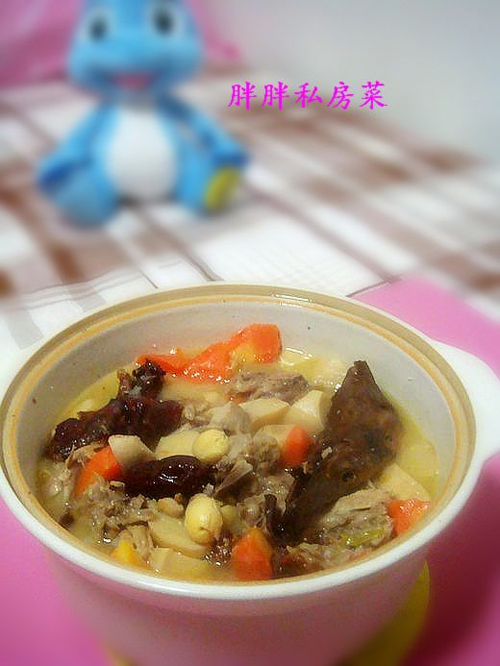 全聚德烤鸭一个,把鸭肉片下来,用剩下的鸭架放入莲子、红枣、杏鲍菇、胡萝卜做成的汤。咸鲜口味。