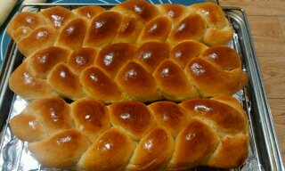 及以下步骤:面团从两边向中间对折。 搓成长条,每3条为一组编成辫子。 编好的辫子在烤箱里进行最后发酵。 已发好的辫子,180度,下层,30分钟,出炉后在烤网上放凉。 烤好的辫子面包。 面团从两边向中间对折。 搓成长条,每3条为一组编成辫子。 编好的辫子在烤箱里进行最后发酵。 已发好的辫子,180度,下层,30分钟,出炉后在烤网上放凉。 烤好的辫子面包。