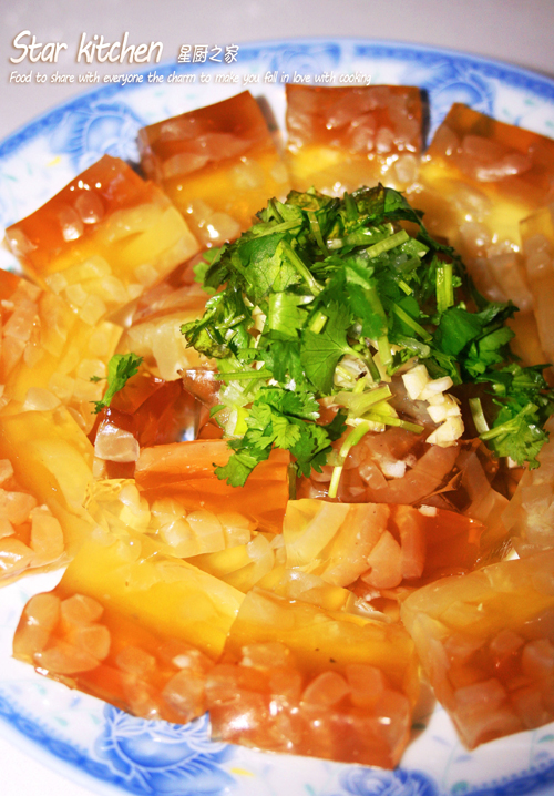 要想把猪皮冻做的既透明又精到,那就要在处理猪皮上多下功夫,清理干净,还有就是再煮猪皮的时候记住一定要煮到水的感觉焦筹状,这样的猪皮及口感好有透明,吃起来很精到,很好吃,希望大家会喜欢