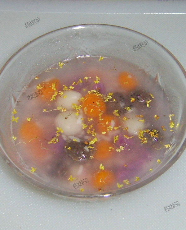 用紫薯做了紫色的细圆子、老南瓜做了桔色的细圆子、黑芝麻粉和红豆沙揉了做成黑色的、原味的白色、、、和着甜酒酿煮了,撒上了些桂花~~ 好看又好吃啊