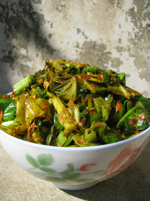 这是新腌好的腊腌菜,还不能吃。 过年的时候回家,看到妈妈洗晒了许多的大苦菜,我就知道做腊腌菜的季节又到了。 这是每年春节前或者春节后妈妈都会进行的工作。 腊腌菜的腌制最用多杆少叶的青菜,我们也叫大苦菜,将大苦菜洗干净,然后晒上五六天,等苦菜的水份有点些晒干的时候,就切成短段或者长段腌制,配上红糖、酒酿、辣椒粉、花椒粉和等配料,撒上食盐,再加入少许白酒,揉搓搅合。最后将菜放入陶罐(俗称坛子)中,压紧密封罐口,放置到阴凉处。 两三个月后取出来,绿色的腊腌菜变成金黄,微酸而带甜,清脆可口。 腊腌菜除了当咸菜下饭,还可以用来炒饭、做酸菜鱼,炒肉,做腌菜洋芋汤,等等,味道妙不可言。 腌的时候多腌一点,这样的腊腌菜放置在阴凉处,不像韩国泡菜一样用冰箱,也可以放很长时间,腌的时间越长,越好吃。 每年过春节回家,腊腌菜还是妈妈给我准备好的一大堆的吃食中最不能缺少的一样,没错,带的就是妈妈的爱和故乡的味道,相信很多思乡的游子能体味。