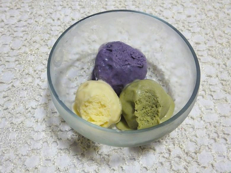 紫色是加的紫薯,绿色是加的抹茶,淡黄色是加的香草精,
