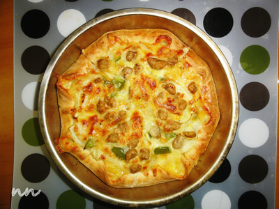 及以下步骤:在匹萨皮表面用牙签均匀扎上孔,均匀涂上番茄沙司,撒上披萨草 铺一点马苏里拉,均匀放上青椒和洋葱 再撒上一层马苏里拉 均匀摆上牛肉粒 再铺上一层马苏里拉 在匹萨周围一圈刷上鸡蛋清(以防烤糊) 烤箱烤制7分钟,看看情况,补一些马苏里拉,再烤制5分钟,看情况烤到奶酪冒泡就可以了(奶酪冒泡好拉丝呢),当当当!大功告成!! 再铺上一层马苏里拉 在匹萨周围一圈刷上鸡蛋清(以防烤糊) 烤箱烤制7分钟,看看情况,补一些马苏里拉,再烤制5分钟,看情况烤到奶酪冒泡就可以了(奶酪冒泡好拉丝呢),当当当!大功告成!!