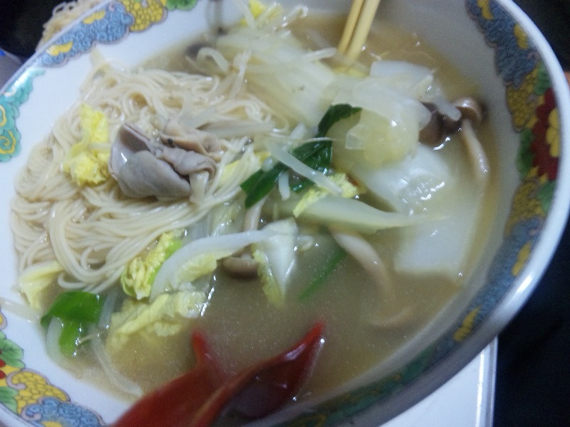 及以下步骤:准备了一捆细面条。 锅煮开,躺得颜色变成乳白色的时候,加少许盐,放小蘑菇进去煮。 煮开一会,再放豆芽。 加白菜白,白菜叶,韭菜 加白菜白,白菜叶,韭菜 放入味素,调下咸淡,把菜盛出来 用剩在锅里的汤,煮面条。 面条好了,盛到小碗里 把面条盛到汤碗里慢慢吃,哦了。 把面条盛到汤碗里慢慢吃,哦了。