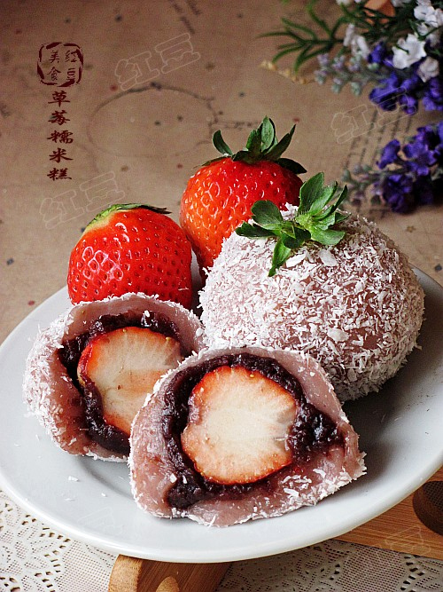 及以下步骤:可抓起一把面粉捏成团,然后在手掌中滚动,不松散说明水分正好。 后把面粉放入蒸锅用手在上面插几个小孔。 盖上盖子大火蒸制15-18分钟。 把草莓洗净用厨房用纸吸去水分。 把草莓放入豆沙馅中 慢慢包起成为馅料。 蒸好的糯米团取出,放入抹油的盆中用擀面杖捣杵5-8分钟以增加面团的粘性。 再把面团分成等份小块。 取一份糯米面团包入豆沙草莓馅。 依次做好在滚满椰子粉即可食用。