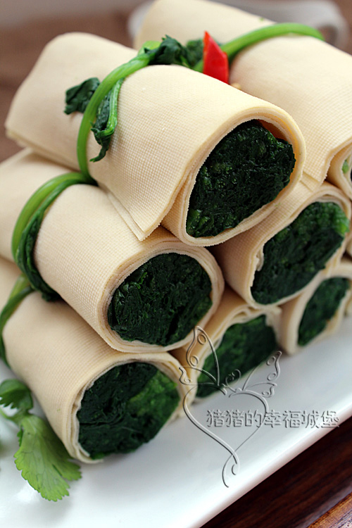 及以下步骤:取一张千张,在一边铺上菠菜。 卷起,切段。 用烫好的香菜缠在豆皮卷外面。 摆盘和黄豆酱一起上桌。 香菜在焯过菠菜的水里烫一下,捞出。 菠菜撰干水份,切去根部。 取一张千张,在一边铺上菠菜。 卷起,切段。 用烫好的香菜缠在豆皮卷外面。 摆盘和黄豆酱一起上桌。