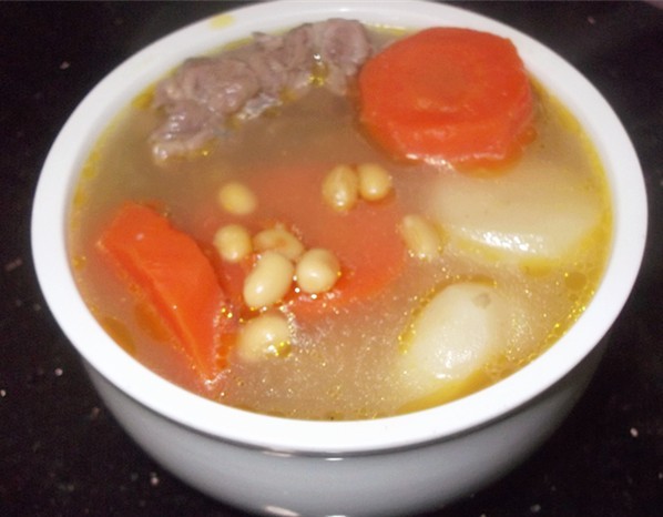 1、黄豆80克,红萝卜250克,马蹄200克,当归5克,猪骨400克,姜3片