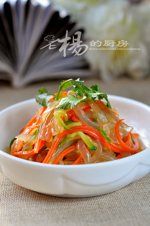 及以下步骤:原料。 黄瓜胡萝卜切丝焯水捞出。 原料。 黄瓜胡萝卜切丝焯水捞出。 原料。 黄瓜胡萝卜切丝焯水捞出。 焯水的开水冲烫一下海蜇丝,立刻放入纯净水中。 海蜇丝和胡萝卜黄瓜沥干水,放入味斗里加调料拌好。 锅里放油,把大葱炸出葱油。 葱油当香油用,淋上即可。