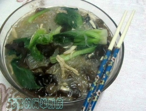 及以下步骤:加入粉丝,和一茶匙盐 加入青菜,倒入鸡丝和高汤略滚, 加少许生抽即可出锅入碗。 小青菜和水发黑木耳适量,切丝 绿豆线粉用温水稍浸泡 鸡胸肉撕成丝,放在高汤里备用 汤锅里倒入水,放入黑木耳煮开 加入粉丝,和一茶匙盐 加入青菜,倒入鸡丝和高汤略滚, 加少许生抽即可出锅入碗。
