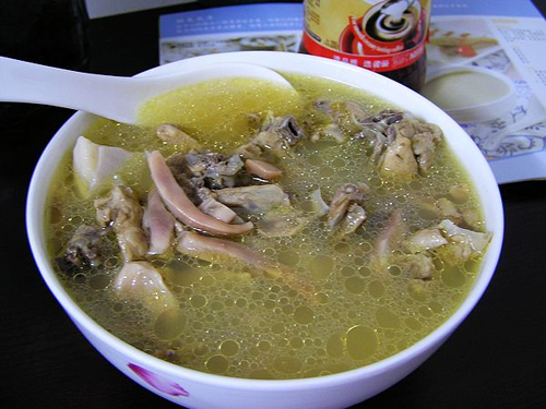2、鸡骨架超市有卖,是去了皮及肉的.比较便宜,比较实惠!鸡骨架加工一下:去油\切块