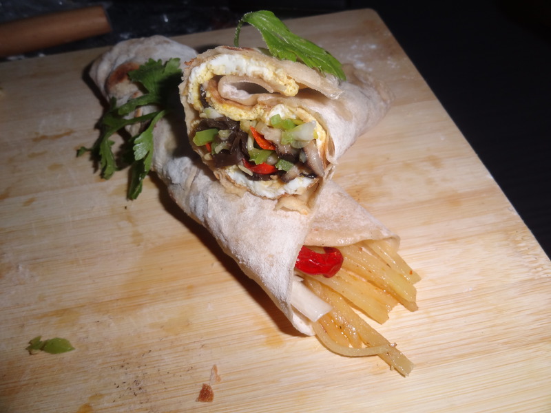 及以下步骤:和面的步骤省略。面饼。 鸡蛋饼。 和面的步骤省略。面饼。 鸡蛋饼。 和面的步骤省略。面饼。 鸡蛋饼。 配菜,又名炒合菜。 土豆丝,刀工很差呀。 菜的火候不同,我先放香菇炒,然后加味达美,依次放其他菜。 炒土豆丝的时候,油热了,放葱姜后放了辣椒面,然后放入土豆丝,味达美,醋,干辣椒,辣辣的吃着很爽。