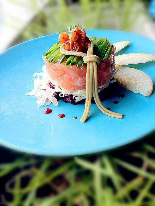 及以下步骤:三文鱼切丁,辣白菜和荷兰豆切丝。柚子切下三片,柚子取其果肉。 剩下的梨打成泥,加入其他调料拌匀成酱汁即可。 三文鱼切丁,辣白菜和荷兰豆切丝。柚子切下三片,柚子取其果肉。 剩下的梨打成泥,加入其他调料拌匀成酱汁即可。 三文鱼切丁,辣白菜和荷兰豆切丝。柚子切下三片,柚子取其果肉。 剩下的梨打成泥,加入其他调料拌匀成酱汁即可。 三文鱼切丁,辣白菜和荷兰豆切丝。柚子切下三片,柚子取其果肉。 剩下的梨打成泥,加入其他调料拌匀成酱汁即可。 将三文鱼、包菜丝、紫甘蓝丝、荷兰豆丝拌入模具压成型,上面摆上辣白菜。 将梨片、柚子摆在旁边,浇上酱汁即可。