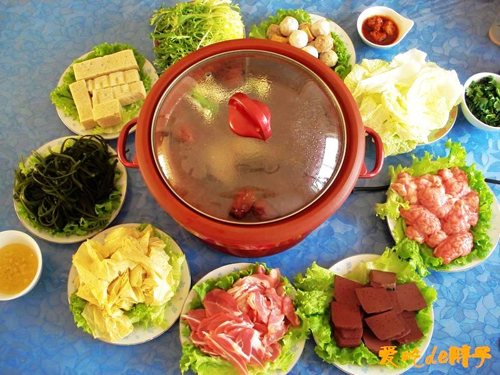 羊肉(500g) / 白菜叶(300g) / 冻豆腐(500g) / 肉丸(400g) / 海带丝(300g) / 油豆皮(300g) / 切面(200g) / 苦菊(200g) / 羊血(300g) / 笨鸡(200g) / 羊脑(500g)