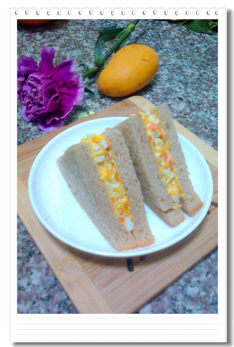 及以下步骤:把炒好的玉米胡萝卜放入小碗中。 加适量沙拉酱。 把沙拉酱和蔬菜丁们搅拌均匀。 取一片吐司,把拌好的鸡蛋蔬菜沙拉酱均匀地摊在上面。 把另一片吐司压上去。 如图斜切两刀即可。 成品。 把另一片吐司压上去。 如图斜切两刀即可。 成品。