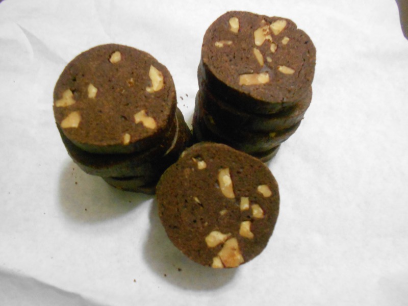 及以下步骤:用保鲜膜包起来放入冰箱冷冻1小时 再切成0.8的厚片,放入预热的烤箱上火170 下火110度,烤20分钟 核桃用150度烤个10分钟,切碎,备用 奶油和糖粉搅拌均匀 加入蛋液,【不要一次加完】分两次加 搅拌好的奶油糊,筛入面粉和可可粉拌匀 再加入核桃,用手抓成团 搓成圆形 用保鲜膜包起来放入冰箱冷冻1小时 再切成0.8的厚片,放入预热的烤箱上火170 下火110度,烤20分钟