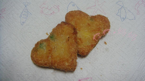 及以下步骤:拌好的鸡肉糊。 鸡肉糊装保鲜袋,在案上压平,目测大约6、7mm厚。垫个硬板放冰箱冷冻,冻硬方便切块就可以。 冻好的肉饼不用去掉袋子,直接切就行。我把冻好的肉饼切成不太三角的三角块,或者你喜欢的形状都好。 鸡块不用沾水,直接裹面包糠,因为切着切着就开始化冻了,再沾水就会软趴趴的不好操作。 如果一次吃不完,就把裹了面糠的鸡块摆盘从新放进冰箱冻,冻硬后装保鲜袋就不会变形、粘连,方便以后取用。 小火煎、炸,炸好用吸油纸吸去多余的油,然后……然后就可以吃了(这两心形的就是完全化冻变形的,我放饼干模里压了下)。 冻好的肉饼不用去掉袋子,直接切就行。我把冻好的肉饼切成不太三角的三角块,或者你喜欢的形状都好。 鸡块不用沾水,直接裹面包糠,因为切着切着就开始化冻了,再沾水就会软趴趴的不好操作。 如果一次吃不完,就把裹了面糠的鸡块摆盘从新放进冰箱冻,冻硬后装保鲜袋就不会变形、粘连,方便以后取用。 小火煎、炸,炸好用吸油纸吸去多余的油,然后……然后就可以吃了(这两心形的就是完全化冻变形的,我放饼干模里压了下)。