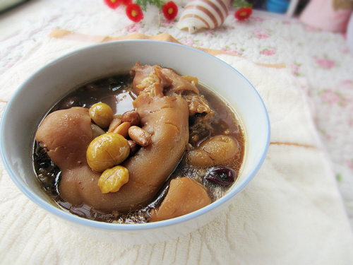 及以下步骤:放入栗子。 加入红枣和花生。 继续小火炖半个小时,加适量生抽、盐、鸡精,出锅即可。 锅内放适量清水,烧开后,放入猪蹄焯10分钟左右,捞出洗净。 栗子放入盐水中煮15分钟,取出剁口,趁热去皮。 猪蹄放入砂锅中,加适量清水,烧开。 撇去浮沫,倒适量老抽和料酒,小火炖2个小时。 放入栗子。 加入红枣和花生。 继续小火炖半个小时,加适量生抽、盐、鸡精,出锅即可。