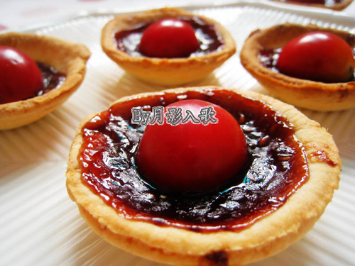 及以下步骤:揉成光滑的面团。 将面团擀成5-6毫米的面皮,用蛋挞模扣出圆的塔皮。 扣好的挞皮装在蛋挞模里,整理好。 用勺子将红山莓酱均匀地装入模具,大概六分满就行。烤箱180度预热,烤20分钟,烤好了以后在中间放上一半儿圣女果。成功了。 黄油加热融化。 融化的黄油倒入面粉中拌匀。 揉成光滑的面团。 将面团擀成5-6毫米的面皮,用蛋挞模扣出圆的塔皮。 扣好的挞皮装在蛋挞模里,整理好。 用勺子将红山莓酱均匀地装入模具,大概六分满就行。烤箱180度预热,烤20分钟,烤好了以后在中间放上一半儿圣女果。成功了。