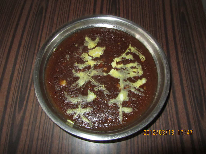 5、倒入烧开的骨头汤,大约按照1:2的比例,边倒边搅,成黏糊状即可。最后淋入几滴香油,放进烧开的蒸锅里,大火40分钟!(可根据量的多少灵活掌握时间)掀开锅盖,在焖子表面用调好的鸡蛋画成想要的图案