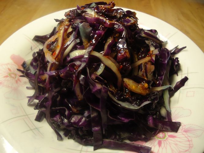 及以下步骤:把调料汁浇在紫甘蓝丝上即可 紫甘蓝一颗 将紫甘蓝剥皮洗净(用淡盐水稍泡一下,起到杀菌消毒的作用) 紫甘蓝一颗 将紫甘蓝剥皮洗净(用淡盐水稍泡一下,起到杀菌消毒的作用) 再将紫甘蓝叶切成细丝 在切好的紫甘蓝丝洒上一些盐稍腌制一会,(会出一些水份) 这时候准备调料汁:将醋、少许的盐、糖、香油、辣椒油、味精兑在一个碗中拌匀 把腌好的紫甘蓝丝挤掉多余的水份后摆盘装好 把调料汁浇在紫甘蓝丝上即可