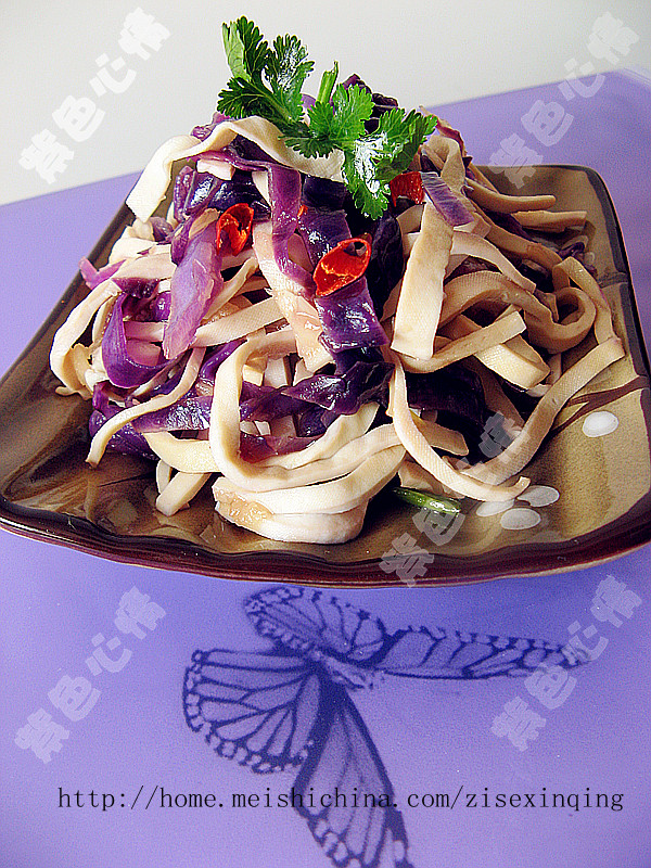 及以下步骤:加入适量香油。 加入适量苹果醋或白醋(加热后的紫甘蓝容易变得黑紫,如果加入白醋可以更好的保持其艳丽的颜色)。所有的调料都加入后搅拌均匀了,就可以食用了。 将紫甘蓝的皮掰开后放入水中洗干净,切成丝。尽量切细一点,这样拌的时候便于入味。豆腐皮洗净也切丝成。香菜洗净切段。大蒜放入蒜臼子捣成蒜泥。 锅内加水烧开,放入紫甘蓝丝,焯一下,变色后马上盛出来,放到准备好的凉开水中。 豆腐丝焯水,也放入另外准备好的凉开水中。 将晾凉后的豆腐丝、紫甘蓝丝攥干水分,放入一个稍微大一点的容器里(便于搅拌)。放入香菜段和蒜泥。(下面就根据个人的口味添加调料了) 加入适量盐和鸡粉。 加入适量味达美。 加入适量香油。 加入适量苹果醋或白醋(加热后的紫甘蓝容易变得黑紫,如果加入白醋可以更好的保持其艳丽的颜色)。所有的调料都加入后搅拌均匀了,就可以食用了。