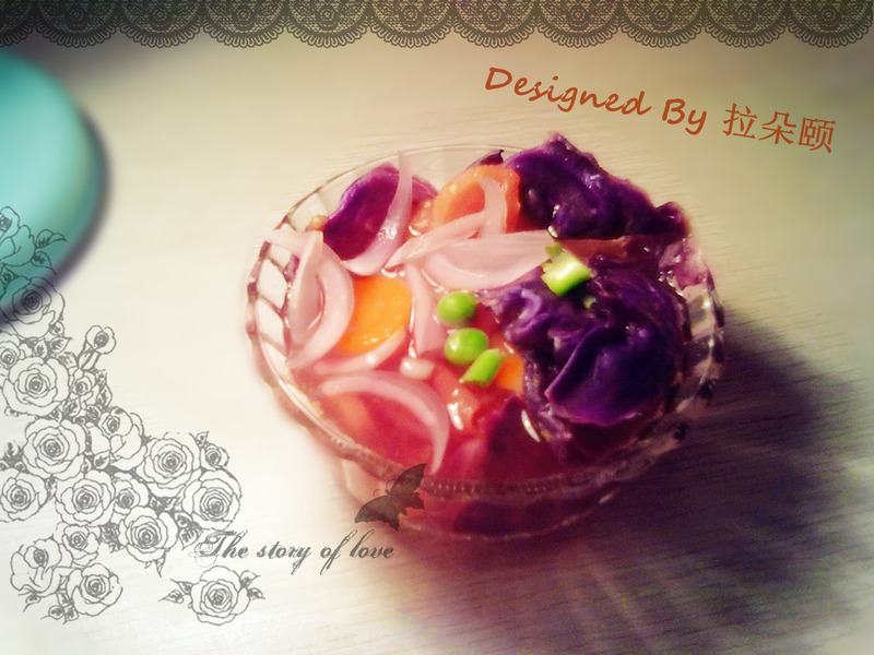 洋葱(小半个) / 胡萝卜(一根) / 西红柿(一个) / 甘蓝(两片) / 小豌豆(一把)
