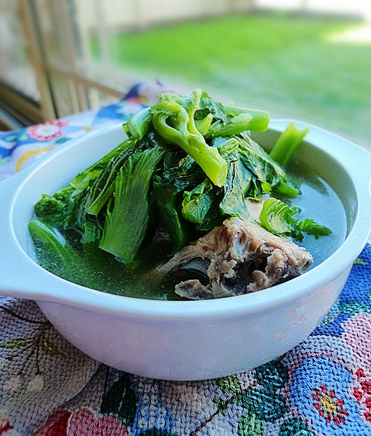 朋友送了些鸡骨架子给我,冰箱又放不下,只好马上去院子摘些芥菜回来煲了这个简单的汤。