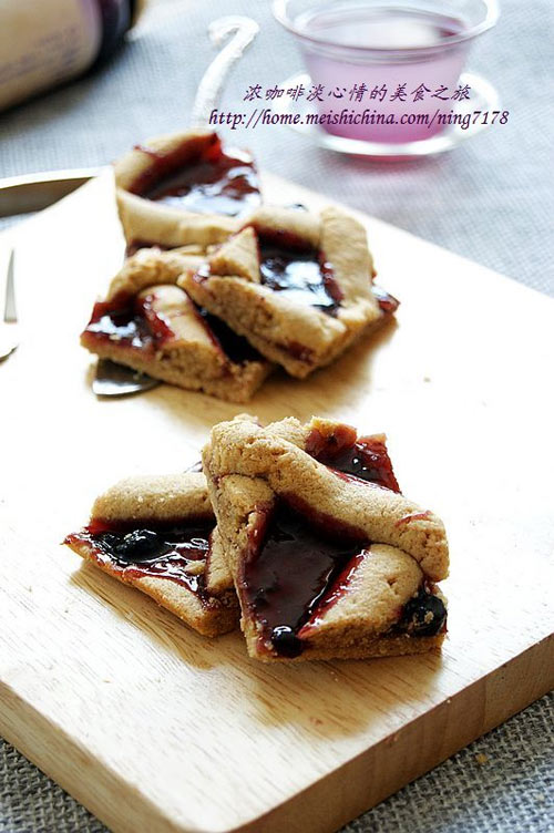 这款饼干想做很久了,自从在书上看见的第一眼就喜欢的不行,那时仅限于视觉上。烤制的过程中,满屋子都是黄油、杏仁和蓝莓果酱的混合香味,中间夹杂着淡淡的肉桂香,俺一直无比期待的站在烤箱旁等着它出炉,成品果然无比美味。蓝莓酱我选用有颗粒的‘希杰大喜大蓝莓果酱’,这样做好的饼干口感更好。肉桂粉的味道如果实在不喜欢,可以少量加,或者不加,不过会影响这款饼干的风味,建议最好不要省略。