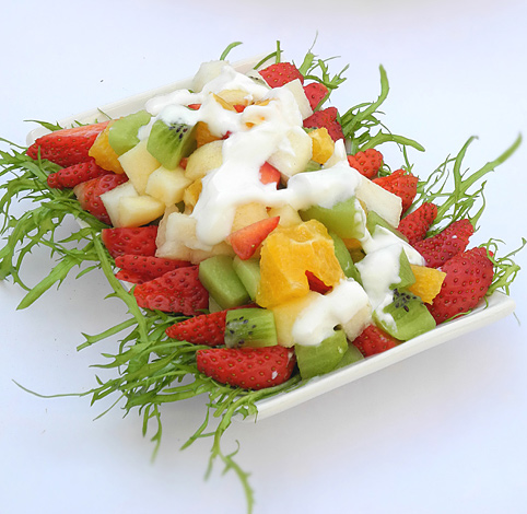 6、苦菊铺盘底,所有水果丁摆上面,再倒入适量酸奶,即可食用。