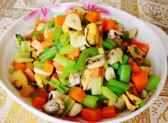 及以下步骤:先把海虹煮开口 把芹菜、胡萝卜切丁入锅烫熟,海虹去壳取肉 先把海虹煮开口 把芹菜、胡萝卜切丁入锅烫熟,海虹去壳取肉 先把海虹煮开口 把芹菜、胡萝卜切丁入锅烫熟,海虹去壳取肉 先把海虹煮开口 把芹菜、胡萝卜切丁入锅烫熟,海虹去壳取肉 大蒜切末 把各种料加入调味料一起拌匀即可