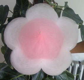 3、将糖丝缠绕完成后,如上图所试,做成圆球状,长约二十公分,直径十五公分即可完成花式棉花糖的花芯制作,