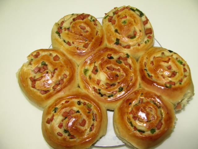 及以下步骤:上面均匀的撒上小葱火腿粒。 然后把面片卷起来。 用刀切成小段,把断面朝上放,就好了。 把烤盘铺上锡纸,放上做好的面包。 再2次发酵30分钟,刷上蛋液。 上下火180度20分钟,就烤好了。 用刀切成小段,把断面朝上放,就好了。 把烤盘铺上锡纸,放上做好的面包。 再2次发酵30分钟,刷上蛋液。 上下火180度20分钟,就烤好了。