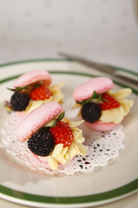 及以下步骤:7.将6装入裱花袋中,挤在铺有高温布的烤盘中。 8.将7放入预热过的烤箱中,以上下火170/100℃约烤12分钟左右。 9.将烤好的马卡龙以两片为一组,中间挤上玫瑰馅,用水果装饰即可。 3.将白砂糖和水放入容器中,以边加热边搅拌的方式煮沸。 4.将3煮至约110℃。 5.将煮好的4倒入打发的2中再打发。 6.将打好的5加入备用的1中,然后用橡皮刮刀充分拌匀。 7.将6装入裱花袋中,挤在铺有高温布的烤盘中。 8.将7放入预热过的烤箱中,以上下火170/100℃约烤12分钟左右。 9.将烤好的马卡龙以两片为一组,中间挤上玫瑰馅,用水果装饰即可。