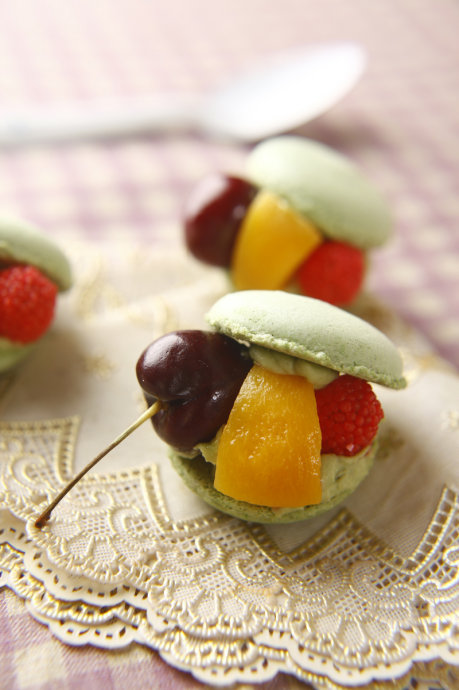 及以下步骤:7.将6放入事先预热好的烤箱中,以上下火170/120℃约烤11分钟左右。 8.将烤好的马卡龙以两片一组,中间挤上馅料,装饰上水果即可。 1.先将白砂糖和蛋白放在一个容器中,然后搅拌至糖化 2.然后用快速将步骤2搅拌打发,打至干性发泡,约用6分钟 3.接着加入绵白糖再打发约6分钟。 4.再加入过筛的杏仁粉和糖粉。 5.然后加入绿茶粉,用刮板充分拌匀。 6.将拌匀的5装入裱花袋中,挤在铺有高温布的烤盘中 7.将6放入事先预热好的烤箱中,以上下火170/120℃约烤11分钟左右。 8.将烤好的马卡龙以两片一组,中间挤上馅料,装饰上水果即可。