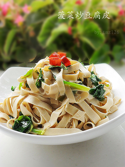 及以下步骤:豆腐皮切丝。 菠菜洗干净,用开水焯一下。 豆腐皮切丝。 菠菜洗干净,用开水焯一下。 豆腐皮切丝。 菠菜洗干净,用开水焯一下。 葱和干辣椒切小段。 豆腐皮放开水里焯一下去去豆腥味。 锅内加油烧热后下葱和辣椒段煸出香味,下豆腐皮翻炒。 然后放入菠菜,加盐和鸡精炒匀即可。