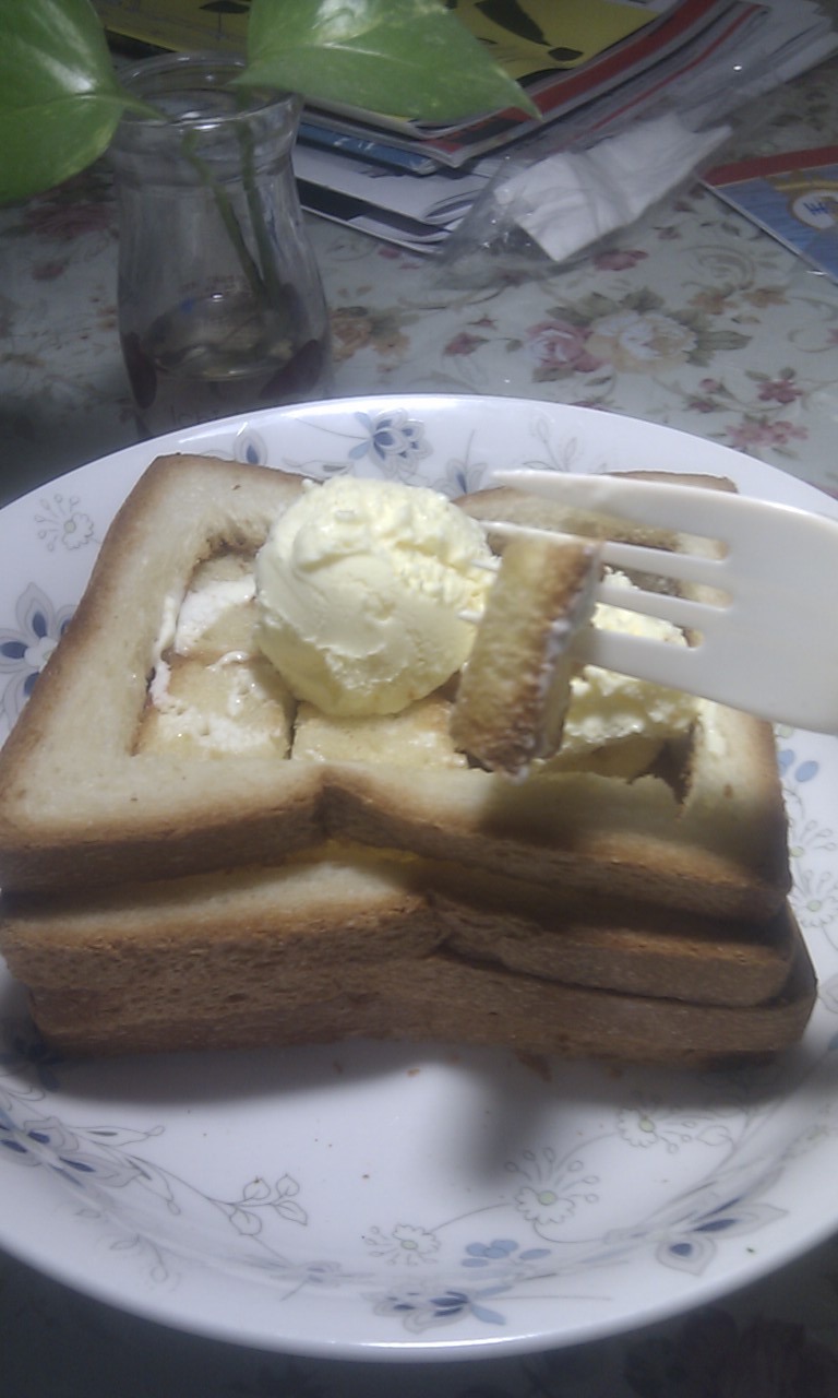 港丽餐厅的招牌点心——蜂蜜厚多士,这个不用介绍了吧,上海的mm几乎人人都知道。想吃上一口美味的厚多士,要排队排好长时间呢,既然入了烤箱,那我们就自己试着做吧,不就是面包加上黄油和蜂蜜么,顶上再盖个冰淇淋球,我大方,盖两个,嘿嘿,而且是新鲜出炉,趁热乎的时候吃吧。。。 我一顿吃了一个,想想这么多的黄油和冰淇淋,罪孽啊,真是甜蜜的诱惑。。。 如果人多的话,那就再码上几片一起烤吧,做个超厚的多士,嘿嘿。。。