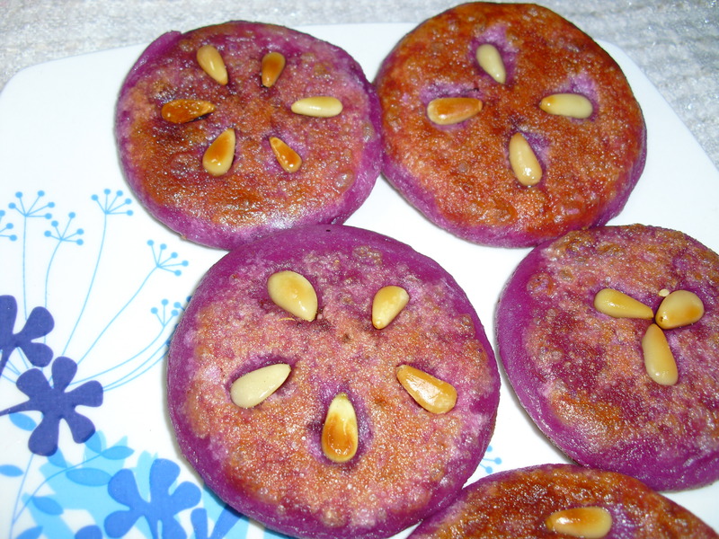及以下步骤:两面煎黄即可。 准备原料。 将熟紫薯捣成泥加入糯米粉和成面团。 准备原料。 将熟紫薯捣成泥加入糯米粉和成面团。 面团分成小剂子,揉圆。 取一个小圆球,用拇指和食指边转边捏压,做成小窝头状。放入适量的绿豆沙馅(虽然颜色不太好看,但是自己做的哟!),再用虎口边转动,边将收口不断收紧,最后封严,压成饼状。 每个小饼上再压上几颗松仁,逐个做完所有的小饼。 平锅中放少许油,油热后将小饼放入锅中. 两面煎黄即可。